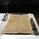 nwirkung auf die Leinwand. Unter dem Stereomikroskop verkleben wir die gerissenen Fäden fadengerecht. Entsprechend fügen wir in ein Loch ein vergleichbares Gewebe wie eine Intarsie ein.