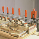 an einem Tafelgemälde wird mit Hilfe von verschiedenen Zwingen neu verleimt.