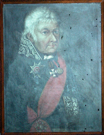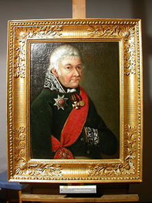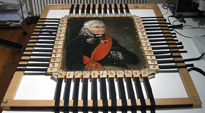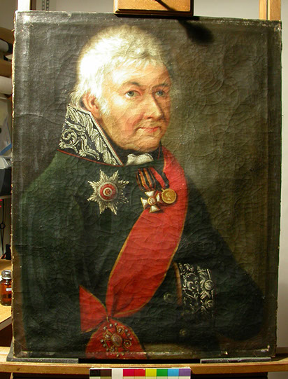 Bei diesem Herrenportrait war das Anheften eines neuen Spannrandes notwendig. Die geschrumpfte Leinwand wurde auf einem speziellen Streckrahmen vorsichtig gedehnt.